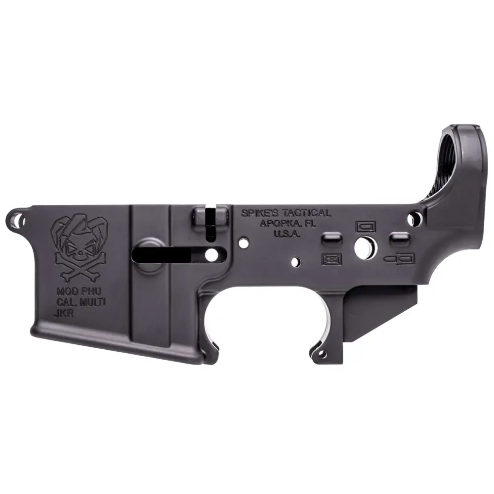 Spike's Tactical stripped lower is made to the highest standards. It is forged from 7075 T6 aluminum it supports multi-calibers, a black hard coat anodized finish, low shelf and is RDIAS compatible. This model has a PHU Joker logo.