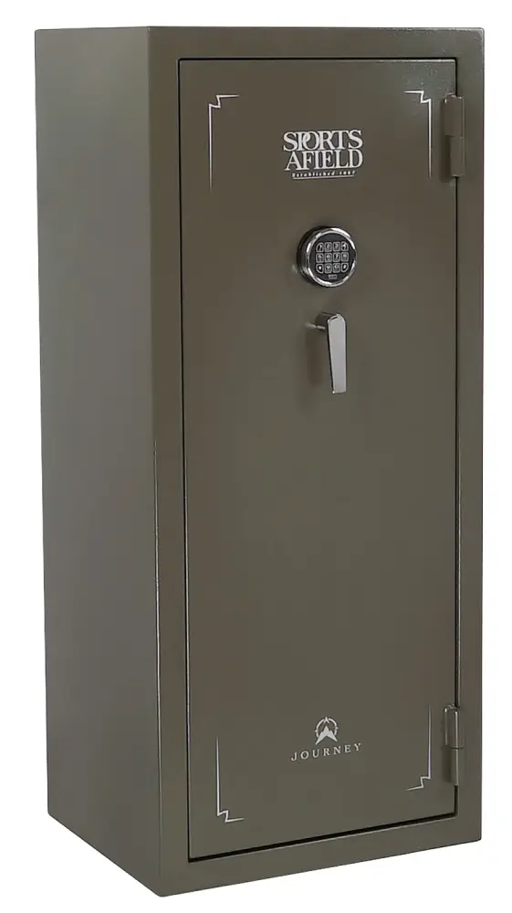 Solid bolt construction along with carpeted interior and shelving make the Journey series of safes a great jumping off point for those seeking total protection. The safe provides the same heavy gauge steel and solid locking bolt construction that Sports Afield's fire safes employ just without the added weight and cost of fire protection and waterproofing. An Electronic lock and drop handle allow quick and easy access to all your valuables. An anti-theft alert system make this the perfect safe for a new family looking to secure those hunting rifles and ammunition. The Journey is also California DOJ approved and includes override keys. This model has an OD green texture finish, holds 30 firearms, and 55" x 24" x 20" exterior dimensions. NOTE: THESE ITEMS ARE DROP-SHIPPED DIRECTLY FROM THE MANUFACTURER. SHIPPING TIME IS 10-15 DAYS AFTER RECEIVING ORDER. FREIGHT COMPANY WILL CALL TO ARRANGE DELIVERY APPOINTMENT ONCE THEY ARE IN LOCAL AREA. SAFES ARE DELIVERED TO DOCK PLATE OR CURB ONLY (NO INSIDE DELIVERY).