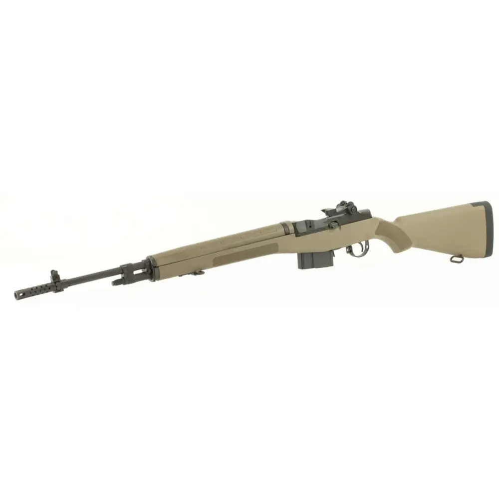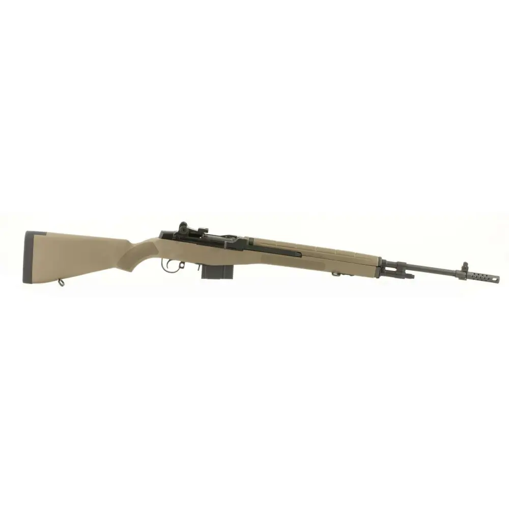 The Standard Series is a faithful semi-auto only recreation of the original M14. Keep in mind that the Standard M1A is as well suited for a day at the range as it is for filling that special place in your military collection. All the design features that the Armed Services found essential for a battle rifle make the Standard M1A a great shooter. The windage and elevation adjustable rear sight minimizes the effort required to zero the rifle. The two-stage military trigger, detachable box magazine, op-rod, and roller cam bolt call to mind the rich history of the M1A while providing functional ease of operation and legendary reliability. This model has a composite FDE stock with a black Parkerized barrel and a muzzle brake. It is CA compliant.