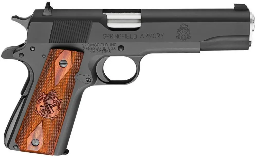 The 1911 Mil-Spec is built on a full-size frame and slide with a match grade, carbon steel parkerized 5" barrel. Its slide features rear slanted serrations. The mainspring housing is the original arched style found on GI issue 1911-A1s, but it includes the Springfield Armory I.L.S. This pistol also has a standard spur hammer and standard grip safety. The single-sided, non-extended thumb safety and short military combat trigger are true to the original 1911-A1 design. Each Mil-Spec comes with a beautiful pair of cross-cannon emblazoned Cocobolo grips that are held in place with slotted grip screws.