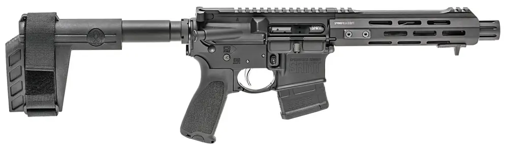 Springfield's Saint AR Pistol features forged upper and lower 7075-T6 aluminum receiver with Accu-Tite tension system and a receiver end plate with QD swivel mount point. It also has a 7.5" 416R stainless steel barrel with Melonite treatment and a SA forward blast diverter. The handguard is free-floating with M-Lok and a forward hand stop. The Saint AR Pistol also features a SB Tactical SBX-K forearm brace, a Bravo Company MOD three pistol grip, carbine "H" heavy tungsten buffer, and a 10-round magazine.