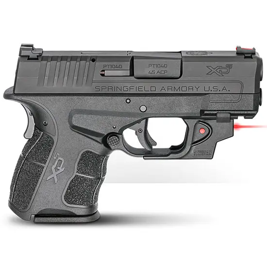 This XD-S model features a black polymer grip with a Viridian Red Laser, a black melonite slide and barrel, and comes with one (1) 5-round flush magazine and one (1) 6-round mid magazine.