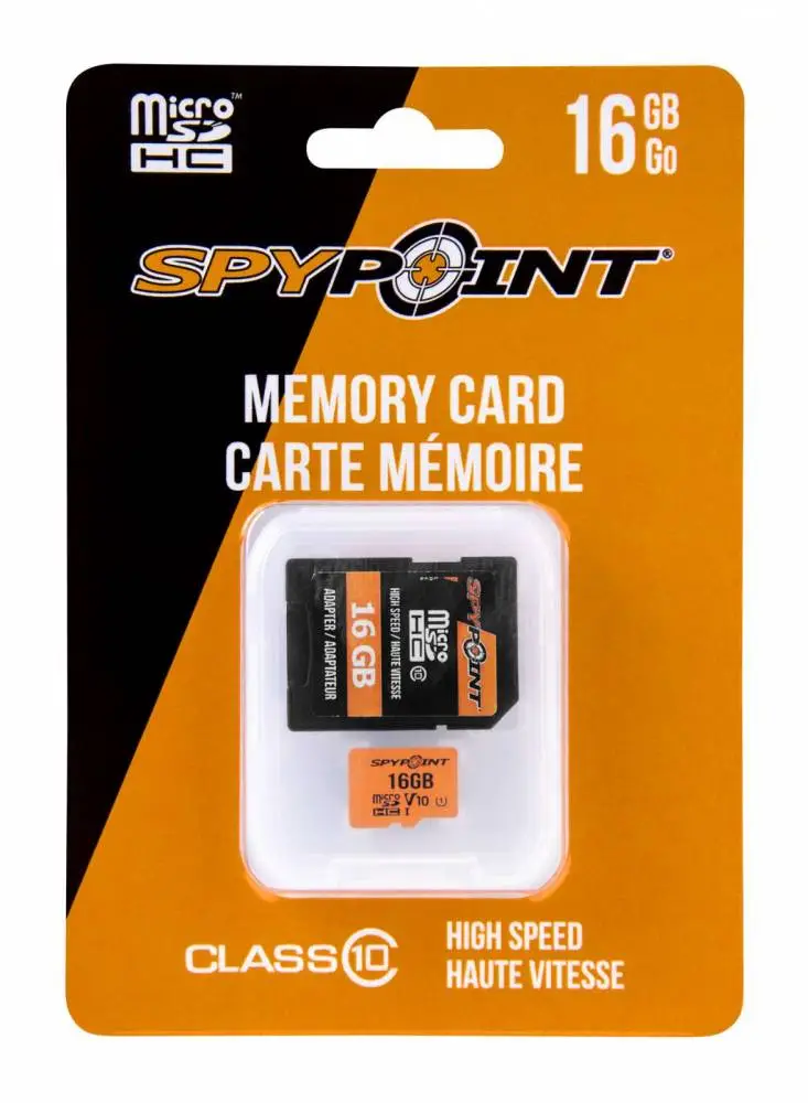 The MicroSD Card, from Spypoint, is an ultra high speed SD card that contains 16GB of memory.