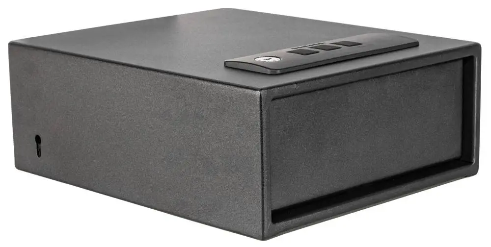 This Quick Access Safe with electronic or biometric lock features a low profile design with a drawer that opens instantly when the combination or fingerprint is entered. This safe is designed to fit in tight spots, yet the large capacity drawer can hold two standard-size pistols and other valuables. The included steel cable allows the safe to be used for securing items while traveling. A low battery warning system, backup key, and all mounting hardware are included.