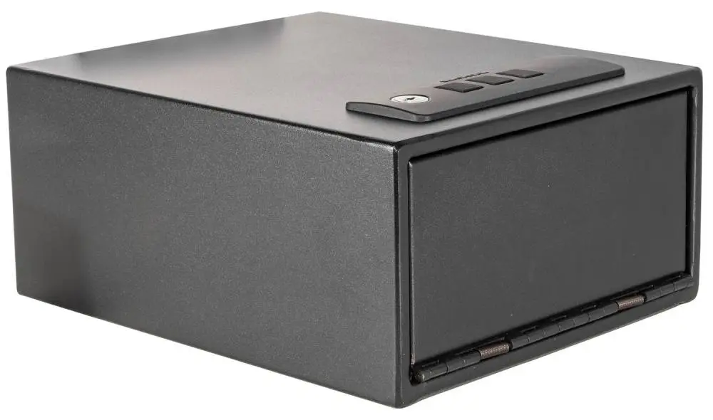 This Stack-On Single Pistol Quick Access Safe with electronic lock is designed to secure a single pistol up to a full-sized 1911 and an extra magazine of ammunition. The removable mounting bracket allows for the safe to be mounted in various ways. A low battery warning system, backup key, and all mounting hardware are included.