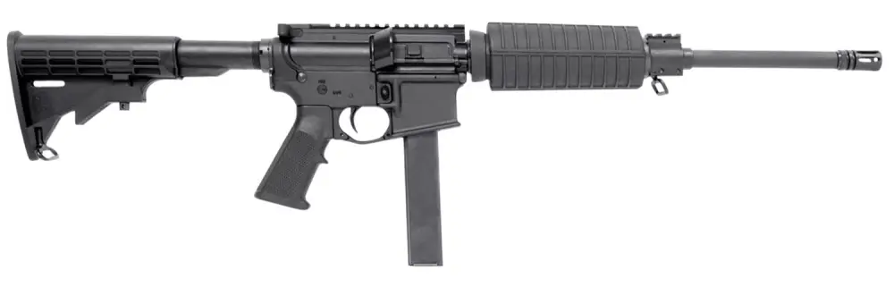 This 9mm model has a 16" barrel, black hardcoat anodized finish, A2 pistol grip and six-position stock.