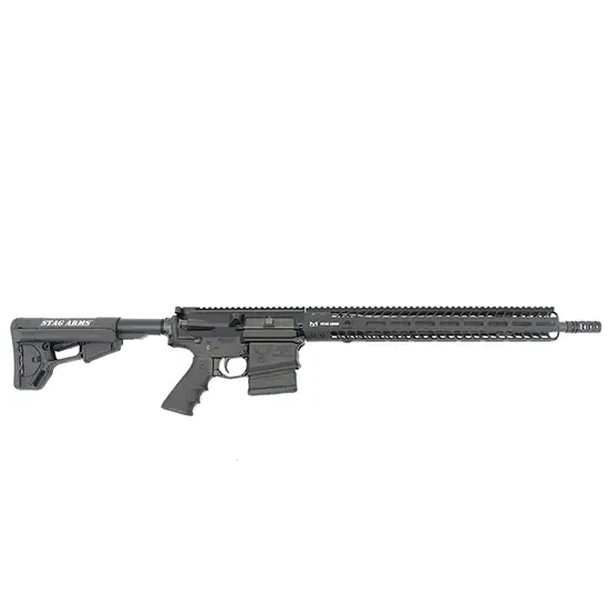 The Stag 10 M-Lok rifle was specifically designed to ease long range shooting with a light-weight ergonomic handguard. It is built around an 4150 steel, chrome lined barrel and uniquely designed forged 7075 T6 aluminum receiver set. The barrel features a VG6 Gamma 762 muzzle brake which virtually eliminates recoil and is is protected by a lightweight, ergonomic 16.5" M-Lok handguard. The Stag 10's unique design features a Stag slant cut, QPQ finish bolt carrier, Magpul ACS stock, and Hogue grip.