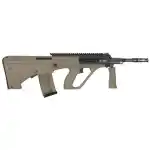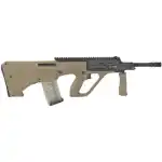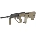 The iconic bullpup-style Steyr AUG has been one of the most recognizable rifles in the world since its adoption by the Austrian army in 1977 and is now available for civilian use as the Steyr AUG A3 M1. The short-stroke gas-piston operation of the AUG runs exceptionally cleaner by nature because all of the operational exhaust gas vents out of the front of the rifle. The AUG A3 M1 has all the classic features and benefits that established it as the pinnacle of modern rifle design. It also features a quick-change barrel with a collapsible forward grip as well as a two-position cross-bolt safety that locks the trigger. This firearm is chambered in 223 Rem/5.56 NATO, has a 16" barrel with a black metal finish, a tan synthetic stock, and has a extended rail for optics.