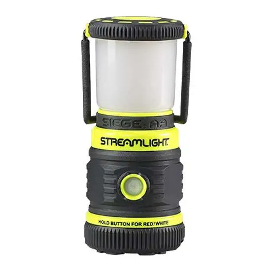 Streamlight's Siege AA lantern features one C4 power LED, and two red LEDs. There are five output modes and a battery level indicator built into the on/off button. With the outer lantern globe in place, the light will float. Use the lantern with or without the outer globe cover. Remove the outer globe and hang the body upside down by the D ring for large area lighting needs. It has a flashing low battery indicator. Battery replacement is a breeze with the center post orienting the battery cover correctly every time. The Siege AA Lantern is waterproof to 1 meter and is 2 meter impact-resistance tested with an unbreakable lens and a rugged, non-slip base. The yellow Seige AA lantern features a magnetic base; three strong magnets make the lantern a versatile, hands-free work light that can be attached to steel surfaces such as engines, machines, or other equipment.