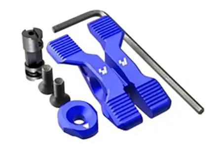 The Strike Switch is a patent pending modular safety selector designed from inception using human factor considerations to aid positive on safe, on fire manipulations. The unique toggle action allows one to quickly engage the safety when moving positions without altering the firing grip. The extended lever arm serves as an index point and thumb rest in either position. The levers are machined from lightweight, but strong aircraft grade aluminum and the safety shaft itself is machined from high strength steel.