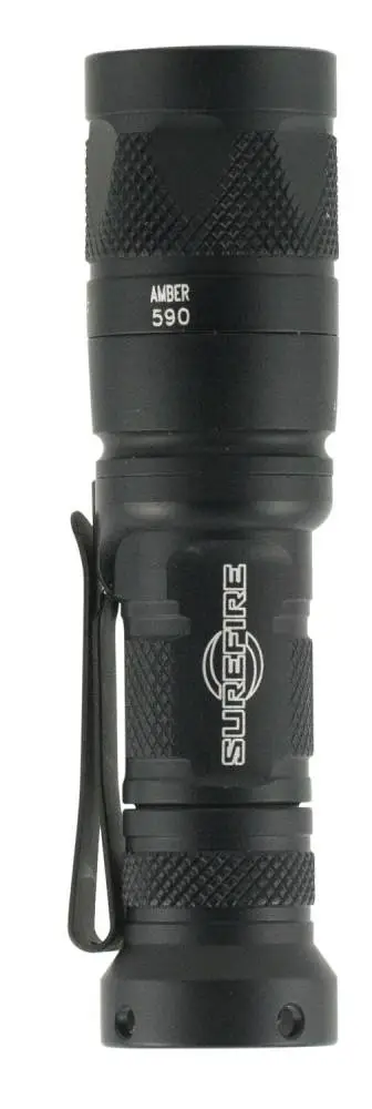 The ultra-compact, dual-output Aviator reinvents a classic SureFire design to provide a primary white LED and secondary colored LED in one sealed head, both focused into a useful beam with ample reach and surround light by a proprietary Total Internal Reflection (TIR) lens. The primary LED generates 250 lumens of smooth, intense white light on high and a user-friendly 5 lumens on low. This model has an amber LED light that has an output of 20 lumens.