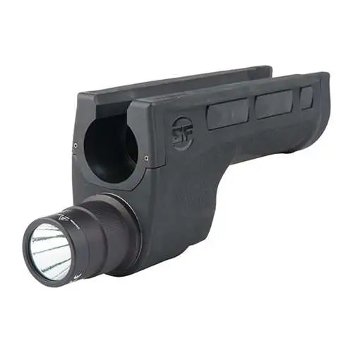 Featuring two levels of tactical illumination, ambidextrous switching, a slender ergonomic design, and legendary SureFire reliability and durability, the DSF-870 is the ultimate WeaponLight for Remington 870 shotguns. The compact, lightweight system replaces the weapon's original factory forend and features a recoil-proof LED that generates 600 lumens of blinding white light at maximum output, or 200 lumens with twice the runtime on its high setting. The LED's light is focused by a precision reflector to create a smooth, wide beam. The DSF-870 features large, tactile momentary and constant-on switches on both sides for precise control by left- and right-handed shooters. It also features an integrated system-disable switch to prevent accidental activation during transport, storage, or stealth operations. A lightweight but strong aluminum module protects the optics, LED, and sophisticated electronics, minimizing length with side-by-side placement of the two lithium batteries that power the system. The module has a Mil-Spec hard anodized finish to protect against scratches, abrasion, and corrosion, while O-ring and gasket seals keep out moisture, dust, and debris. The slender forend body is made from extremely tough polymer and is textured for a secure hold and features large, tactile momentary and constant-on switching on both sides. The DSF-870 is compatible with any Remington 870 shotgun.