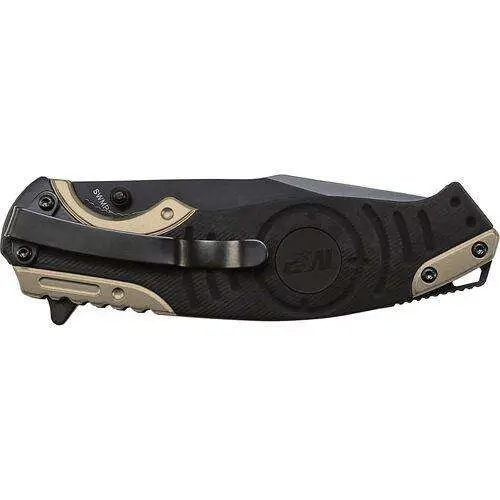 The M&P Folder features a 3.5" 8Cr13MoV stainless steel black clip point blade with partial serration. Its handle features gold inserts.