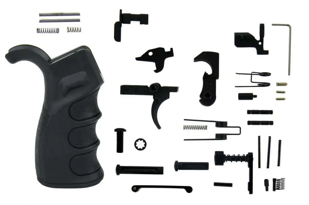 TacFire's .308 Lower Parts Kit includes one each of the following- PGAR-B Pistol Grip, Pistol Grip Screw, Pistol Grip Lock Washer, Trigger (USA made), Trigger Pin, Trigger Spring, Angled Trigger Guard, Hammer (USA made), Hammer Spring, Hammer Pin, Bolt Catch Roll Pin, Bolt Catch Spring, Detent Spring, Bolt Catch Buffer, Take Down Detent, Bolt Catch, Magazine Catch Spring, Magazine Catch Button, Magazine Catch, Front Pivot Pin, Detent Selector, Take Down Pin, Buffer Retainer Pin, Buffer Retainer Spring, Disconnector Spring, Disconnector, Selector and Selector Spring.