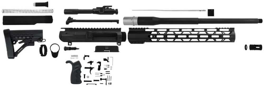 The TacFire SS-RK6 6.5CRD rifle build kit contains- 18" 6.5 Creedmoor barrel, NIB extension/nitride; birdcage flash hider w/crush washer;AR15/.750 micro/low profile gas block/mil spec/steel; mid length gas tube with pin/steel; 15" .308 low profile MLOK free float handguard; .308 DPMS low profile stripped upper receiver /AR 10/.308 charging handle aluminum w/steel latch; dust cover; AR15 forward assist; AR15 standard receiver end plate; Mil-Spec/commercial castle nut/steel; buffer tube aluminum; AR 10 3.8 oz heavy buffer w/tube spring; AR15 enhanced pistol grip; AR10 .308 bolt carrier group. *Sports South Exclusive.