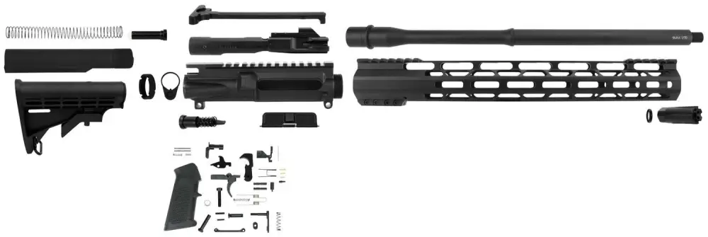 The TacFire Rifle Kit contains- 9mm 16" barrel/nitride; 9mm flash forwarder style muzzle brake; slim 7" MLOK handguard 15" w/barrel nut; AR15 5.56/.223/.300AAC stripped billet upper receiver w/M4 feed ramps, 9MM Gen 2 Hybrid BCG; AR15/.556 Mil-Spec charging handle aluminim w/steel latch; dust cover; AR15 forward assist; AR15 standard receiver end plate; Mil-Spec/commercial castle nut/steel; Mil-Spec buffer tube w/aluminum; 5.5oz buffer w/tube spring; Mil-Spec M4 style 6 position stock; AR15 USA made lower parts kit; AR15 standard A2 style black pistol grip. *Sports South Exclusive.