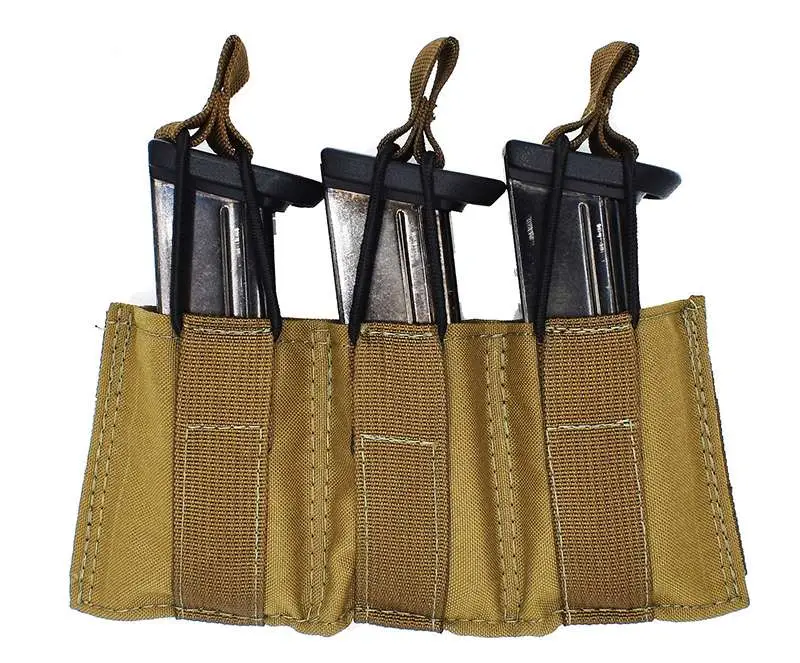 Triple SPEED LOAD MOLLE Pistol Magazine Pouch is designed with durability and fast reloading of your pistol in mind. Constructed with tough 1000 Denier Nylon exterior and blackened grommets that serve as convenient drain holes. Magazines are retained with top quality elastic cords and convenient pull tabs. Just flip them over when needing quick access when things get fast and furious.