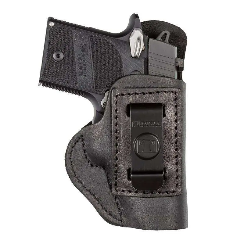 Tagua's Soft Inside The Pant holster features reinforced saddle leather construction retains its shape when the handgun is removed. It has a combat grip, clip on design, and open muzzle.