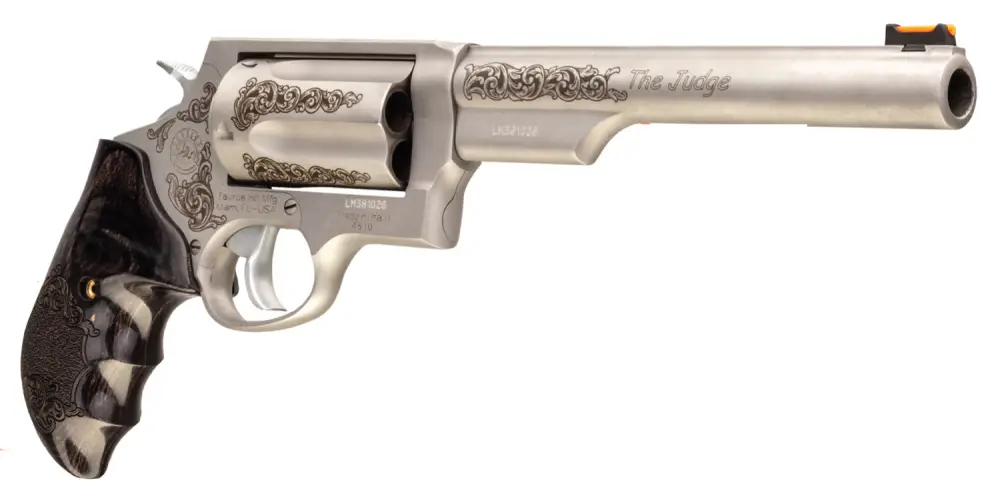 The Taurus Judge that is trusted by many for both home defense and hunting just got even sweeter. This model features custom, English scroll engraving, by Baron Engraving. Along with Scrolled Charcoal Dymondwood Altamont Grips. Not only do you get a firearm that has been used and trusted by many, but also you get a piece of art.