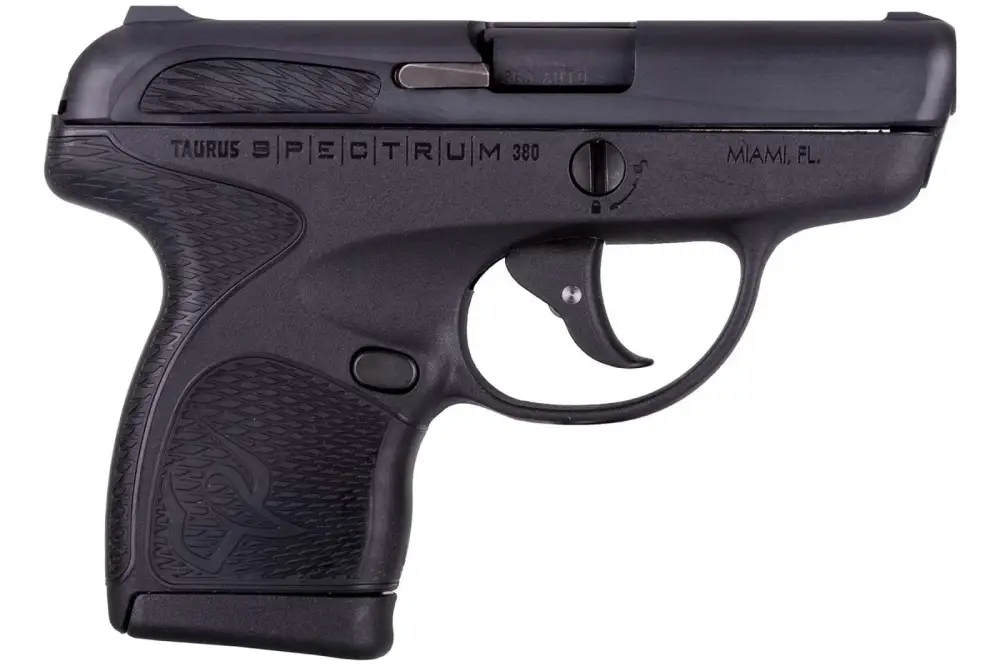 Taurus' Spectrum was designed for concealed carry. This subcompact pistol weighs a hair over 10 ounces and carries six rounds in a flush-fitting magazine. The included extended magazine gives you an additional round and a little more surface area to the grip. It has low profile, fixed sights, a loaded chamber indicator, and an internal lock. A distinctive feature of the Spectrum is the polymer color accents located on the slide and grip.