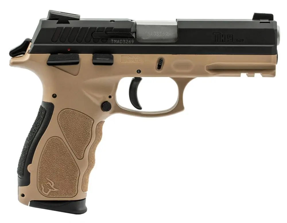 The Taurus TH series features hammer-fired, SA/DA with a manual safety and an ergonomic, textured polymer grip/frame with an integrated accessory rail. The matte black carbon steel slide has front and rear drift adjustable Novak sights. The full-size TH pistol has a 4.25" slide for an OAL of 7.72" and interchangeable backstraps. This exclusive TH9 model has a Flat Dark Earth frame finish with black backstraps and includes two 17-round magazines.