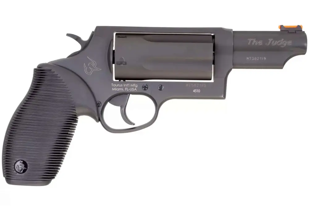 The Taurus Judge Magnum is capable of chambering both .410 gauge 2.5" or 3" shotshells and 45 Colt ammunition. This amazing combo is ideal for short distances where most altercations occur, or longer distances with the 45 Colt ammo. Taurus has finely tuned the rifling to spread the shot pattern at close quarters or to guide the .45 caliber bullet to the target. This model has a 3" barrel with a fiber optic front sight and fixed rear. It has a matte black metal finish and a black Ribber grip.