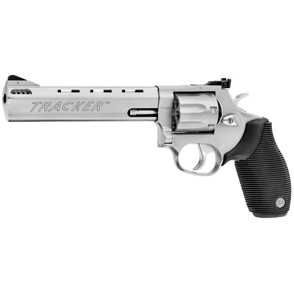 Extremely comfortable to fire and easy to control, the Tracker Series maintains a high level of accuracy, rock-solid performance, and near-indestructible construction. The Model 627 revolver 357 Magnum has a 7-round cylinder, and makes a practical choice for backpacks and tackle boxes, especially where there are bears and other predators around. It has a transfer bar safety as well as the Taurus Security System. The 627 features factory-tuned barrel porting and a gas expansion chamber for recoil, as well as the ergonomic, shock-absorbing Ribber grip. It has a matte stainless steel metal finish with a fixed front sight and adjustable rear sight. This model has a 6.5" barrel.