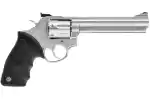 The .357 Magnums have comfortable rubber grips and deep, lustrous finishes. The Model 66 has adjustable target sights and a seven shot cylinder. Available in matte stainless steel or blue steel with 4" or 6" full underlug barrels, all carry the Taurus Security System and unlimited lifetime repair policy.