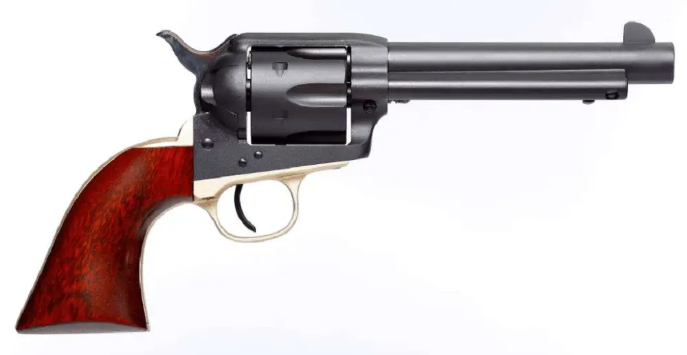 The Old Randall was designed with the famous Kentucky & West Virginia family feud in mind. This model features a matte blued forged steel frame, matte blued finish parts, case hardened hammer, matte brass backstrap & trigger guard, and walnut Navy size grip.