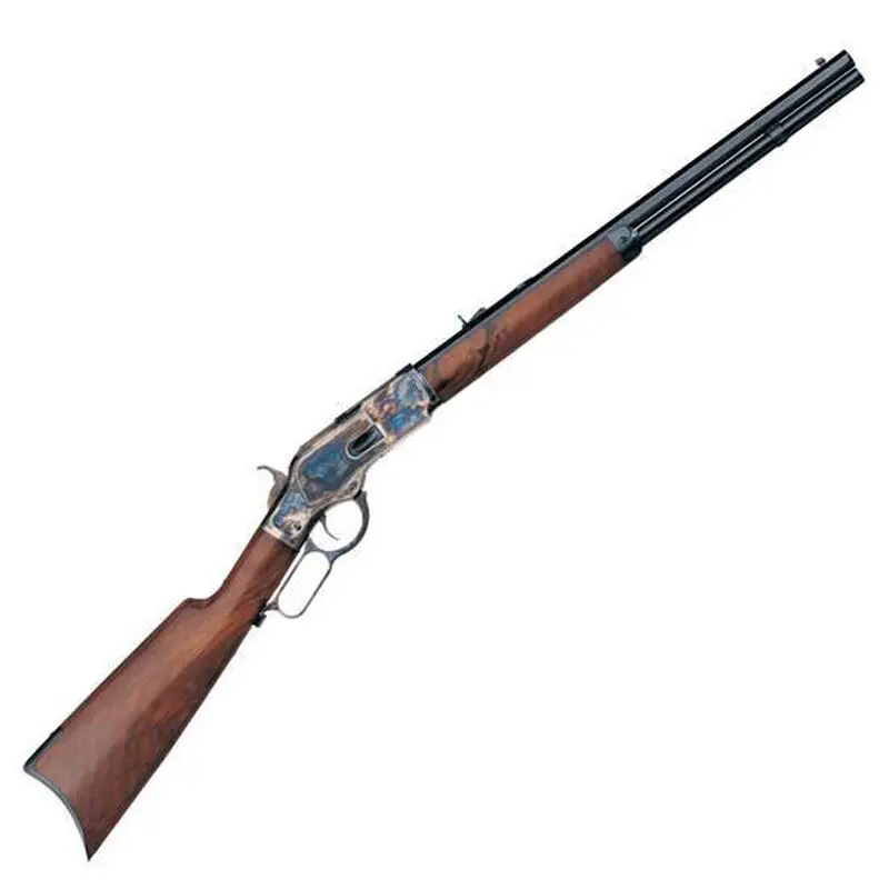 Taylors and Company reproduction of Winchester's 1873 repeating rifle "The Rifle that Won the West" comes chambered in .357 magnum with a 20" barrel. It features a Case hardened frame, a straight stock with checkering, octagonal barrel, enhanced grip, and a rear adjustable sight.