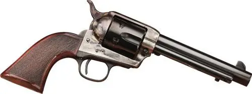 Taylors and Company has reproduced The Short Stroke Smoke Wagon in .45 Long Colt. This pistol comes with a 4-3/4" barrel and has been custom Taylor tuned and is a short stroke improved single action. Featuring a case hardened frame and blue finish with a richly detailed checkered Navy grip for comfort and improved aim. This Taylor Tuned model has a trigger pull set at 3 pounds and features one of the smoothest hammer and trigger pulls on the market. Widened sight channel and widened front blade sight with a 6 cartridge cylinder and weighing 2.27lbs.