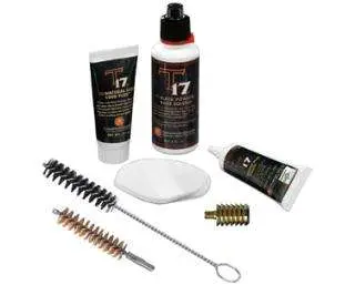 T/C's T-17 Muzzleloader cleaning kit is for thoroughly cleaning and conditioning your muzzleloading firearm and keeping it in top shape. Included is a 2 oz. bottle T-17 bore cleaning solvent, .75 oz. T-17 natural lube, .5 oz. T-17 breech plug anti-seize grease, (20) 2.5" dry cotton cleaning patches, 50 cal. extended cleaning jag and bronze bore brush, and a breech thread cleaning brush.