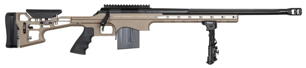 Co-developed by Performance Center and Thompson/Center Arms for extreme long range shooting, the Performance Center T/C Long Range Rifle is built on an aluminum chassis stock and includes a 20 MOA picatinny-style rail and 5R rifled, fluted barrel for enhanced accuracy. It is built for the precision shooter, featuring an adjustable cheek piece and butt plate for a custom fit and built-in Magpul M-LOK slots for quick, easy mounting of accessories. The rifle features a threaded barrel with muzzle brake and a Performance Center trigger. It also features bipod legs. This 243 Winchester model has a flat dark earth receiver finish an black barrel.