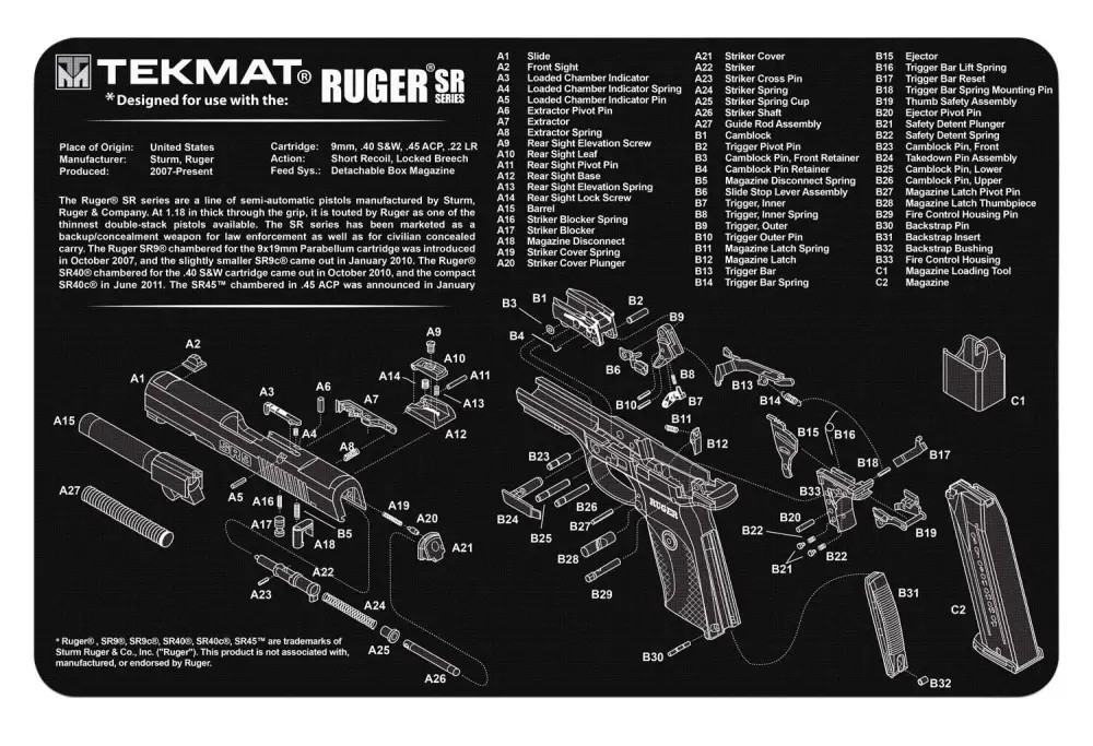 The Tekmat Ruger SR9 gun cleaning mat measures 11 x 17 and is 1/8 thick. The over-sized design gives you plenty of room to disassemble your handgun and to clean it without having to move parts all over. This mat comes with an overview of the history of the Ruger SR9 as well as a simple to follow parts diagram of the parts that make up your Ruger.