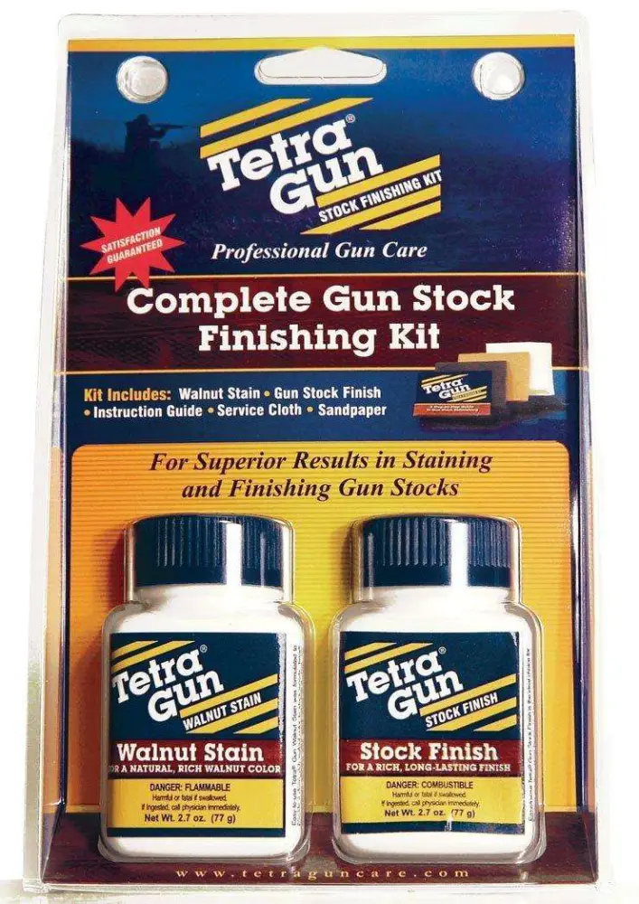 The Complete Gun Stock Finishing Kit brings out the natural beauty in wood stocks. This kit includes a walnut stain, gun stock finish, service cloth, sandpaper (120, 280 & 400 grit), and instruction guide.