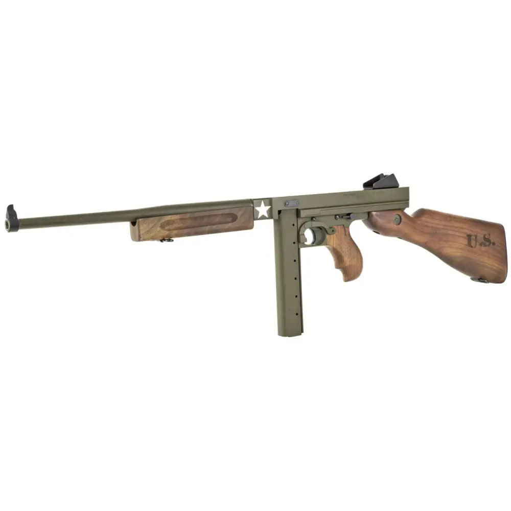 The Thompson M1 was used victoriously in battles throughout the world, inscribing its place for all times as a legend among military firearms. The M1 Carbine "Tanker Thompson" dedicated to the memory of the brave American soldiers who faced the enemy in steel chariots like the M4 Sherman Tank. Auto-Ordnance is proud to honor America's armored warriors with this commemorative Thompson. Each Tanker Thompson is cerakoted in Army O.D. Green. The white star of the Sherman Tank is engraved just in front of the magwell. The "U.S" logo is engraved on the buttstock. This model is all steel with high grade walnut furniture. The 16.5" barrel is exceptionally accurate. This model comes with two magazines, one 30-round and one 20-round.