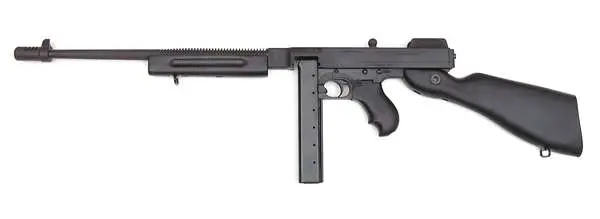 The classic details of the time honored original are reproduced in today's semi-auto Thompson 1927-A1. This .45 caliber carbine features a 16.5" finned barrel and genuine American walnut woodwork. It has a blade front sight with an open rear adjustable sight. This Commando model is has a pinned compensator for an 18" barrel length. The frame and receiver are machined from solid steel with a black Parkerized metal finish. The walnut furniture has a durable, painted black finish. It includes one 20-round stick magazine and a black nylon sling.