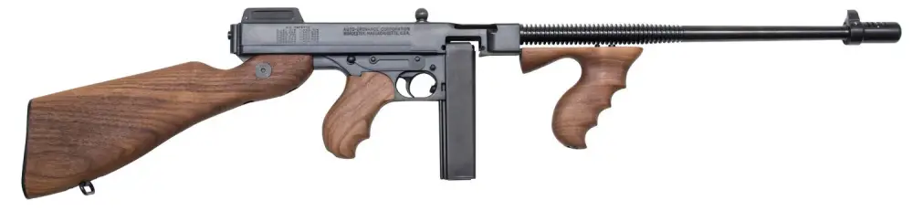 All the classic details of the time honored original are reproduced in today's semi-auto Thompson 1927-A1. This Lightweight Deluxe model is a 9mm carbine with a 16.5" finned barrel and genuine American walnut woodwork. It has a blade front sight with an open rear adjustable sight. This Deluxe Semi-Auto model has a pinned compensator for an 18" barrel length. The frame and receiver are machined from a solid billet of aluminum with a blued metal finish, and a fixed buttstock, pistol grip and vertical foregrip. It includes one 20-round stick magazine.