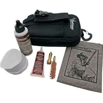 Traditions Field Cleaning Kit includes a gun cloth, dry patches, bronze brush, cleaning jag, EZ Clean 2 breech plug grease, EZ Clean 2 cleaning solvent, and a belt pouch with a caribiner to easily attach to a belt loop or backpack. It is sized for .50 caliber.