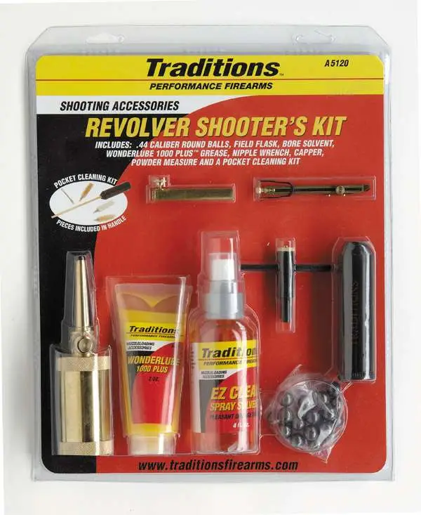 Revolver sportsman kit has powder flask, adjustable powder measure, deluxe nipple wrench with pick, #11 straight line capper, wonder lube 1000 Plus, 44 caliber round balls, 44 caliber pocket cleaning kit, bronze bristle brush, nylon bristle brush, cleaning swab, slotted jag, two piece rod with storage handle for all tools, and EZ clean spray solvent.