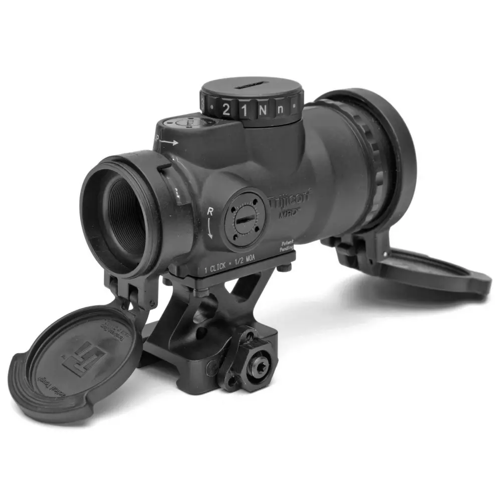 The Trijicon Miniature Rifle Optic (MRO) is a reflex-style, sealed sight intended for use on rifles, carbines, and shotguns to provide fast target acquisition. It is designed to be used with both eyes open, providing the operator with maximum situational awareness. Advanced lens coatings and electronics produce a crisp red dot. The brightness control dial on the MRO is specifically designed for ambidextrous usage. Its hard-anodized, forged 7075-T6 housing is fully sealed and waterproof, providing durability in demanding conditions. The MRO Patrol includes an ocular lens cover to protect glass from damage and to reduce glare and reflections as well as an objective cover and ARD, as well as a MIL-SPEC rated 1/3 Co-Witness quick release mount with return to zero accuracy.