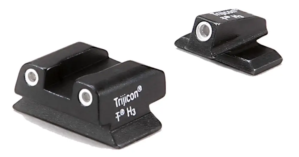 Trijicon Bright & Tough Night Sights are three-dot iron sights that increase night-fire shooting accuracy by as much as five times over conventional sights. They are housed in a metal body, cushioned within silicone rubber, and feature a unique shock-resistant design. Each lamp is capped with a sapphire jewel to help evenly distribute the light while protecting the lamp from solvents and puncture. It is contained within aluminum cylinders for additional protection.