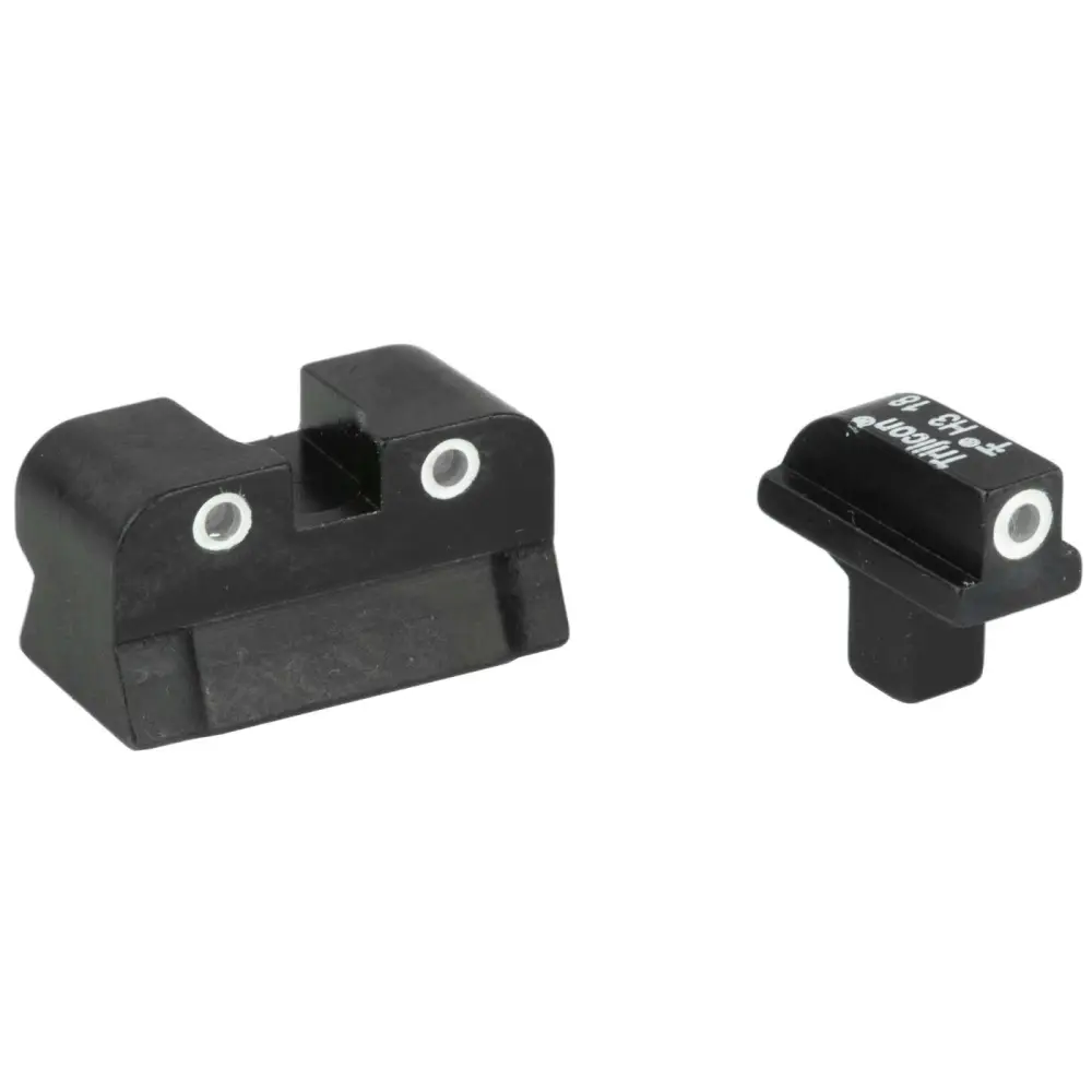Trijicon Bright & Tough Night Sights are three-dot iron sights, housed in a metal body, and cushioned within silicone rubber. Each lamp is capped with a sapphire jewel to help evenly distribute the light while protecting the lamp from solvents and puncture. They contained within aluminum cylinders for additional protection and come with a CP25F-TOOL installation tool.