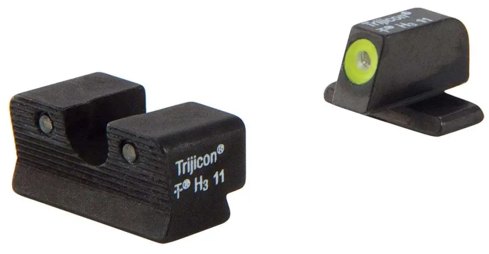 These HD Night Sights were specifically created to address the needs of tactical shooters. Its three dot green tritium night sight set's front sight features a taller blade and an aiming point ringed in photoluminescent paint while the rear sight is outlined in black and features a wider U-shaped notch. This unique configuration increases visibility and quickens front sight acquisition even in transitional lighting. Additionally, the front surface of the rear sight is steeply hooked to assist in emergency one-handed slide operation.