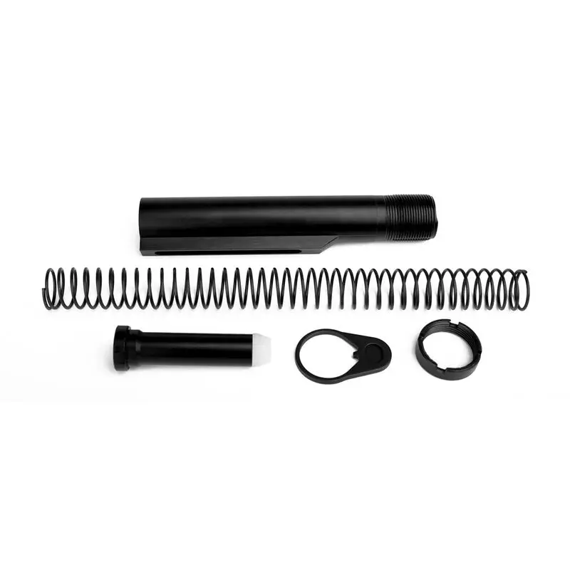 Trinity Force's AR Receiver Extension Kit includes a standard buffer spring, 3oz carbine buffer, castle nut and lower receiver end plate. It is parts are constructed from aircraft grade aluminum and a high strength steel with a black hard coat anodize finish. The 11" buffer tube also features rolled threading.