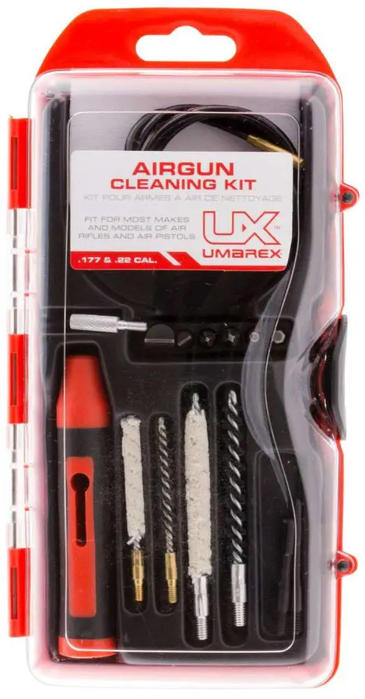 This Umarex Airgun Maintenance Kit contains parts for both .177 and .22 caliber airguns and comes in a compact carry case that fits within a range bag or glove box. It includeds: 33 inch flexible cleaning rod with retaining grommet, .177 and .22 nylon brushers, .177 and .22 cleaning mops, .177 and .22 cleaning jags, 25 cleaning pads, a .22 caliber thread adapter, a multi-functional handle that converts to a convenient screwdriver, 6 screwdriver bits:2 flat blade bits, 2 Phillips head bits, 1 3mm hex head bit, 1 4mm hex head bit.