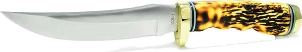 Uncle Henry's Golden Spike has a rat tail tang and a 5" fixed, clip point blade made from 7Cr17 High Carbon Stainless Steel. It has 4.40" Staglon handles with a nickel silver guard and pommel. The Golden Spike comes with a brown leather belt sheath with a sharpening stone.