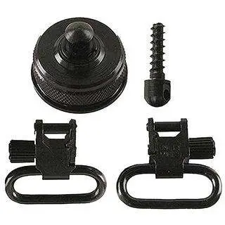 Uncle Mikes magazine cap swivel set has a factory magazine cap with the swivel base already installed. Just unscrew the factory magazine cap and replace it with the new cap. For the buttstock, a 3/4 inch wood screw swivel base is included, along with two super swivels with tri lock.