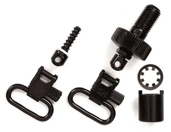 Uncle Mikes magazine cap swivel set has a factory magazine cap with the swivel base already installed. Just unscrew the factory magazine cap and replace it with the new cap. For the buttstock, a 3/4 inch wood screw swivel base is included, along with two super swivels with tri lock.