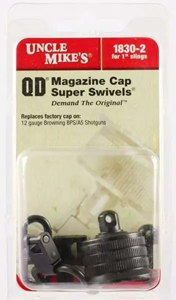 Uncle Mikes magazine cap swivel set has a factory magazine cap with the swivel base already installed. Just unscrew the factory magazine cap and replace it with the new cap. For the buttstock, a 3/4 inch wood screw swivel base is included, along with two super swivels with tri lock.